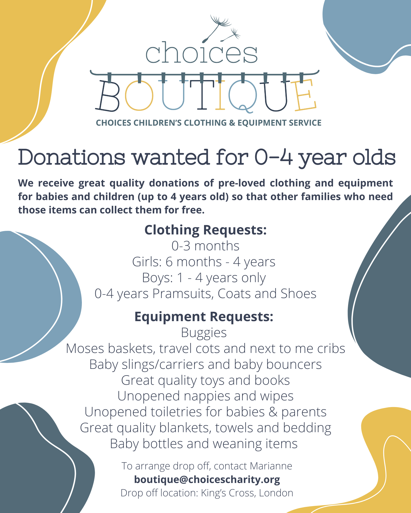 Donations can be made on most Friday mornings 10am-12pm at our Boutique on Pentonville Road in Kings Cross. Please contact us in advance to ensure that someone is available to receive your donation. boutique@choicescharity.org